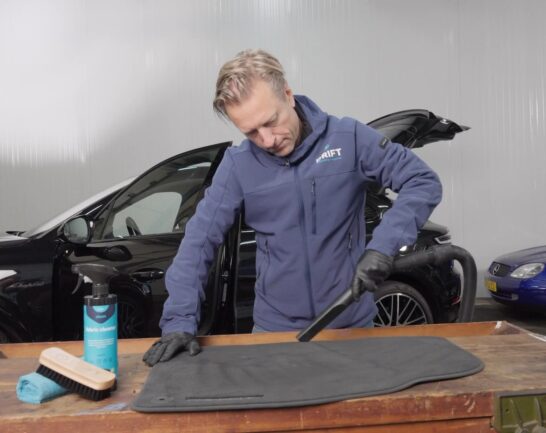 Verwijder eerst al het losliggende afval en spullen uit de auto en haal de automatten eruit; die reinig je later. Stofzuig vervolgens het volledige interieur grondig en werk van boven naar beneden, zodat vuil niet opnieuw op reeds gereinigde delen terechtkomt. Kwetsbare oppervlakken, zoals leer, stofzuig je eventueel i.c.m. met een detailkwast om beschadiging te voorkomen. Geef extra aandacht aan plekken waar vuil zich ophoopt, zoals kiertjes in de bekleding, onder de stoelen en langs randen. Goed stofzuigen voorkomt dat vuil nat wordt en zich dieper in materialen vastzet.
