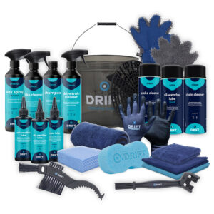 Voor de aandrijflijn biedt de set geavanceerde oplossingen zoals de Drivetrain Cleaner en Kettingreiniger, aangevuld met een Fietskettingborstel en een Cassetteklauw- en Aandrijflijnborstel. Deze tools maken zelfs de lastigste plekken eenvoudig schoon, zodat uw ketting en tandwielen optimaal blijven presteren. Of het nu droog, nat of wisselvallig weer is, met de keuze uit Chain Lube Dry Weather, Wet Weather, en Wax, of de veelzijdige All Weather Kettingspray, is uw ketting altijd perfect gesmeerd.