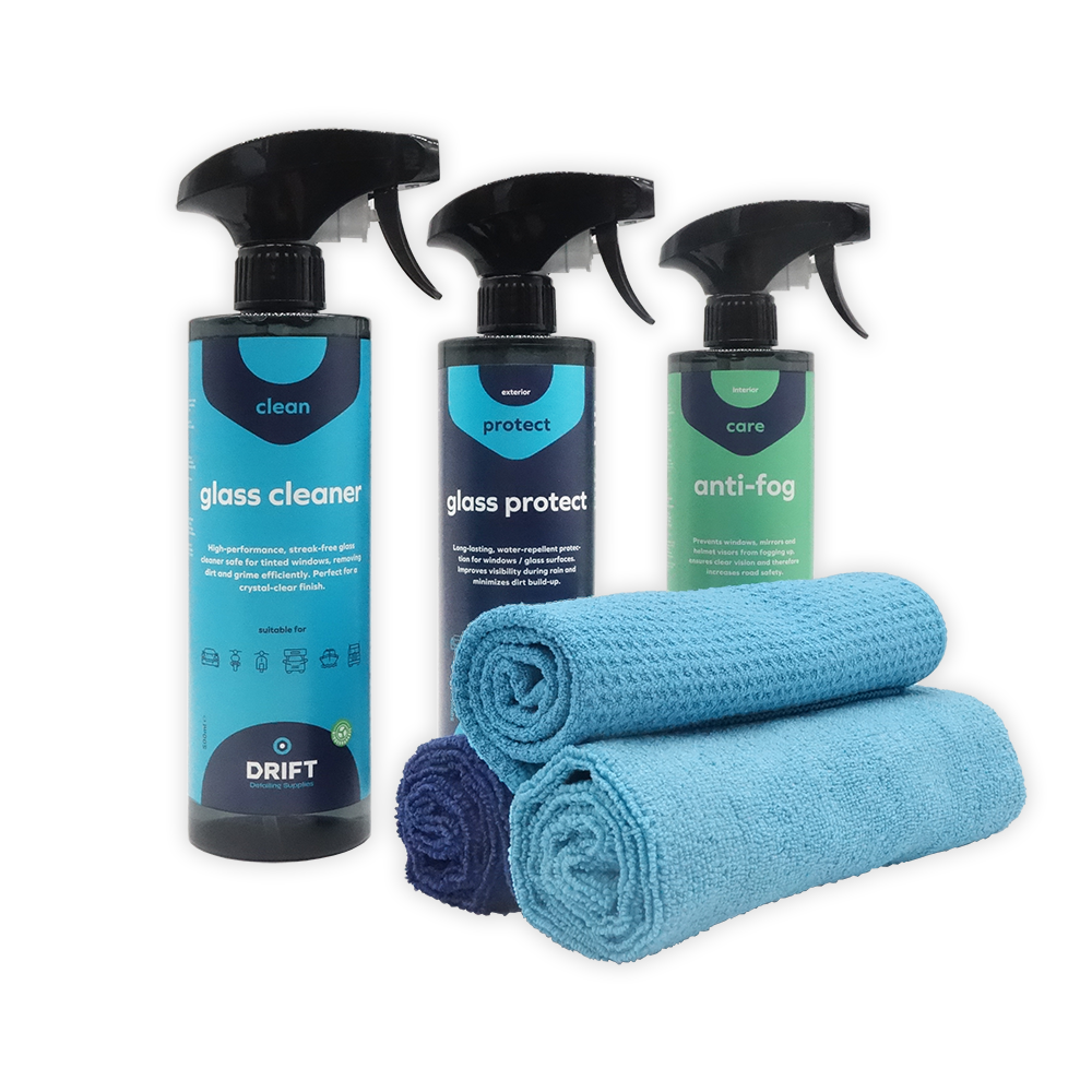 Met het 'Glass Package' haal je in één keer alles in huis voor perfect schone en beschermde autoruiten. De krachtige Glass Cleaner verwijdert vuil, vet en insectenstrepen moeiteloos. Glass Protect voorziet je ruiten aan de buitenzijde van een duurzame, water- en vuilafstotende coating, waardoor regen en viezigheid nauwelijks grip krijgen. Met Anti Condens pak je hinderlijke condensvorming aan de binnenzijde aan – ideaal voor frisse ochtenden en natte dagen. De meegeleverde microvezeldoeken en de speciale glasdoek zorgen voor een krasvrij, streeploos eindresultaat.