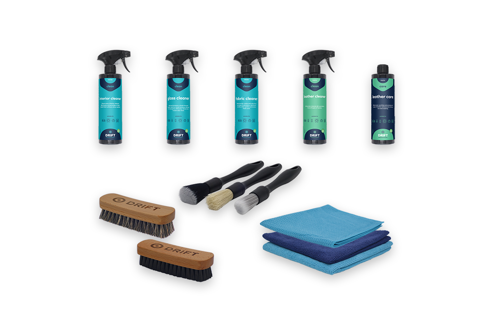 Interieurreiniger - 500 ML Reinig je auto-interieur met zorg met deze krachtige reiniger – veilig, snel en streeploos resultaat. Microvezeldoeken (2 stuks) Ultra‑zachte, hoogwaardige microvezeldoeken – veilig voor elk interieuroppervlak, zonder krassen. Glass Cleaner - 500 ML Geeft autoruiten een ultieme streeploze glans met deze premium Glass Cleaner – kristalhelder resultaat. Glasdoek Voor het kristalhelder reinigen van iedere autoruit – streeploos en vlekkeloos. Detailing Kwasten (3 stuks) Drie typen detail-kwasten voor in- én exterieur — perfect voor nauwkeurig schoonmaakwerk. Leerreiniger - 500 ML Milde reiniger voor leer, alcantara en kunstleer – verwijdert vlekken zonder glans. Leerverzorger - 500 ML Voedende onderhoudscrème voor je lederen interieur – houdt het soepel, beschermd én als nieuw. Leerborstel Zachte paardenharen leerborstel met houten handvat — ideaal voor stoelen, deurpanelen en dashboard. Textielreiniger - 500 ML Krachtige textielreiniger voor stoffen autobekleding en vloermatten — fris, vlekkeloos resultaat. Textielborstel Ergonomische borstel voor (auto)textiel — verwijdert hardnekkig vuil zonder schade.