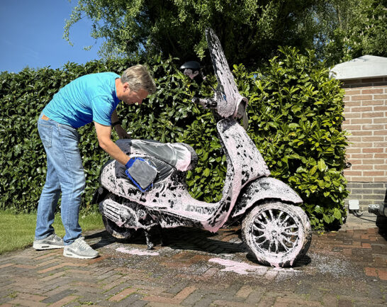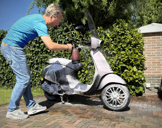 Begin met het grondig afspoelen van je scooter, bijvoorbeeld met een gieter of tuinslang. Zo verwijder je het grootste deel van het vuil en verklein je de kans op krassen tijdens het schoonmaken. Let goed op dat er geen zand of steentjes achterblijven, want die kunnen tijdens het poetsen lelijke beschadigingen veroorzaken. Als je een hogedrukreiniger gebruikt doe dit dan niet op te hoge druk of zorg ervoor dat je kwetsbare delen niet raakt, omdat dit schade kan aanrichten aan gevoelige onderdelen van je scooter. Met deze eerste stap leg je de basis voor een goede reiniging. En dan volgt het leukste deel: het inschuimen!