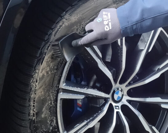 Nu je toch bezig bent; breng de Wheel Cleaner ook aan op het rubber / de ‘wang’ van de autoband en borstel deze schoon met een bandenborstel. Vaak zie je dat van het zwart ogende rubber een hoop vuil loskomt.