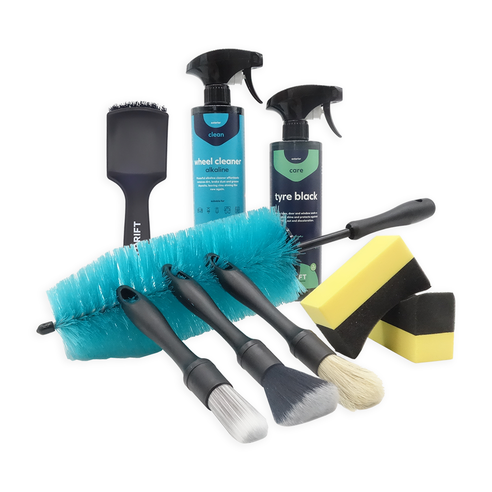 Met het Wheel Package haal je alles in huis om je wielen – van velg tot band – perfect te reinigen én te verzorgen. De krachtige Wheel Cleaner lost hardnekkig remstof op, terwijl de Velgenborstel, Detailkwasten en Bandenborstel je helpen om ieder hoekje veilig en grondig schoon te maken. Vervolgens geef je je banden een diepzwarte finish met het hoogwaardige Bandenzwart, strak aangebracht met een bandenapplicator.